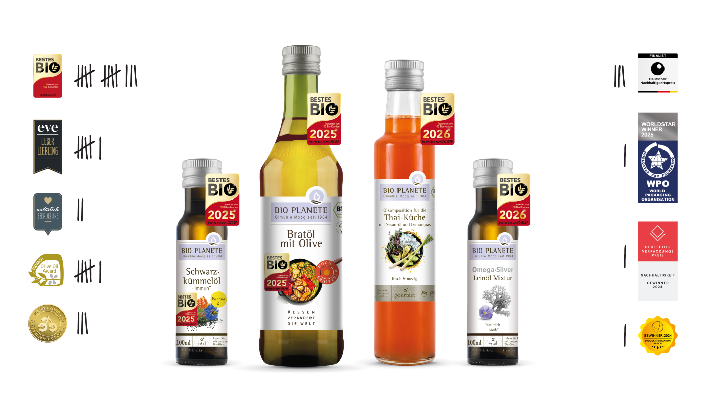 Leinöl nativ trägt als erstes BIO PLANÈTE-Öl das „Bestes Bio“-Siegel. Bis heute werden acht weitere Öle ausgezeichnet.