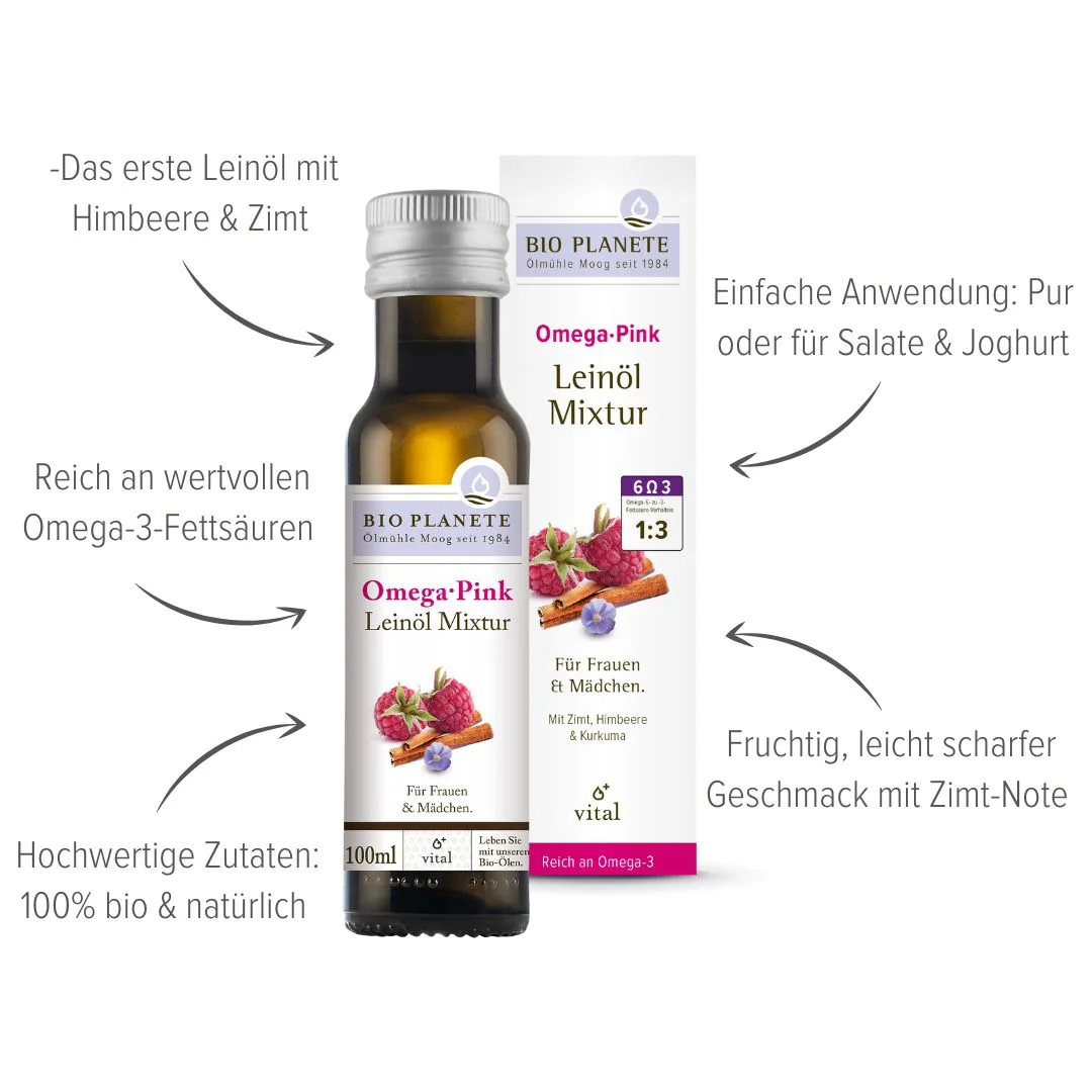 Ob als morgendlicher Start oder nährstoffreicher Boost zwischendurch – Omega Pink liefert essentielle Fettsäuren, Antioxidantien und natürliche Power. Pflanzlich, bio, vielseitig – für eine Ernährung, die rundum gut tut.