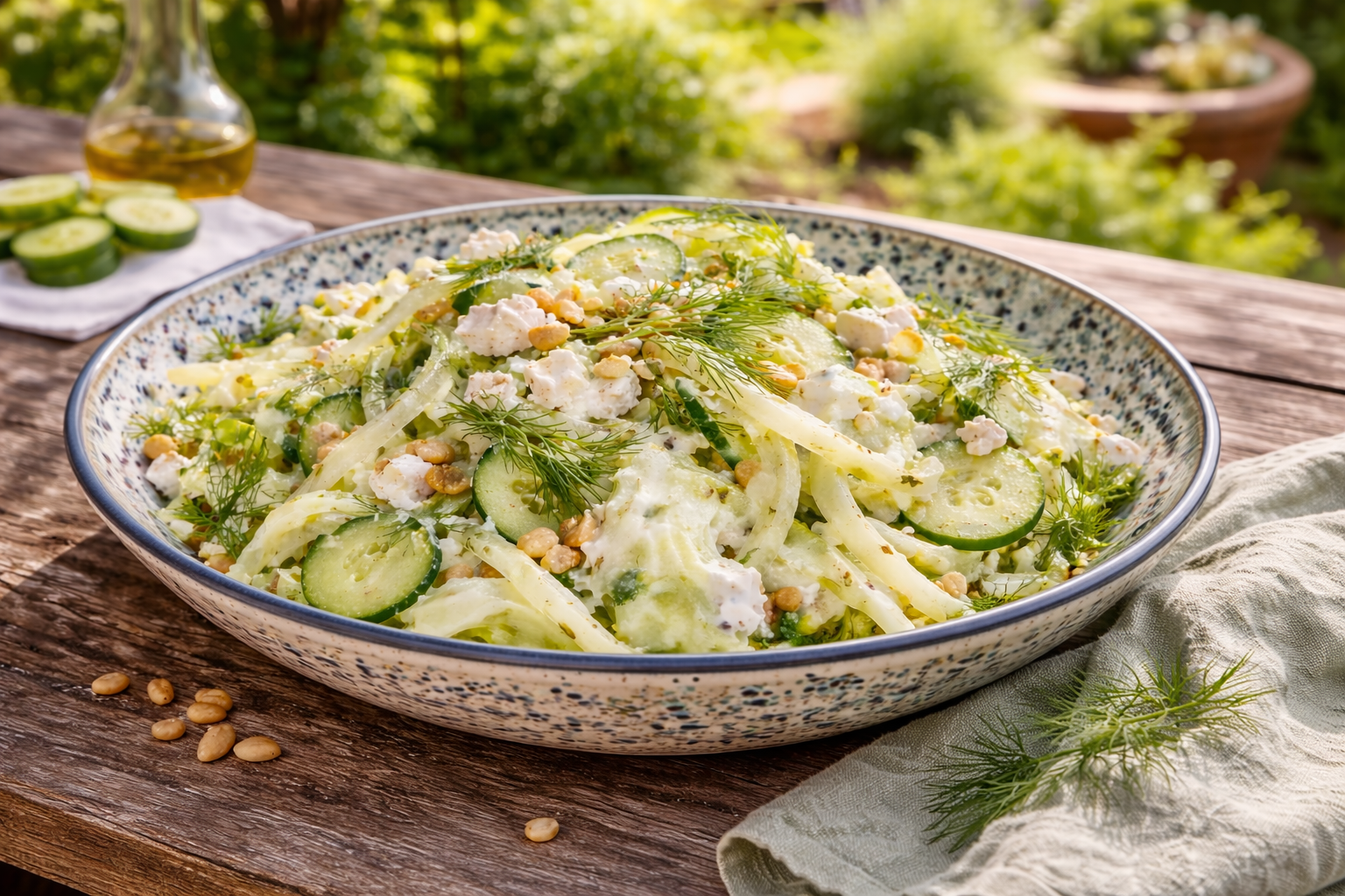 Unser »Fenchel-Gurken-Salat« ist ein echtes Nährstoffpaket aus Ballaststoffen, Vitaminen und Proteinen. Er ist also nicht nur lecker, sondern kann auch was. Gurke, Kohlrabi, Fenchel, Staudensellerie und ein cremiges Dressing aus Naturjoghurt, Senf, O'citron sowie etwas Süße. Die Zubereitung der Basis ist alles andere als aufwändig. Geröstete Pinienkerne sorgen als Topping für einen nussigen Biss. Und wer will, kann dem Ganzen mit etwas Feta noch eine herzhafte Krone aufsetzen.