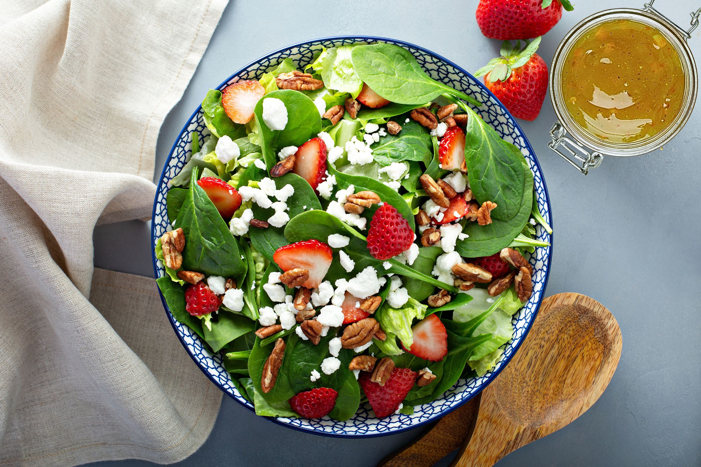 Wenn es mal wieder schnell gehen soll, ist der »Bunte Sommersalat mit Erdbeeren« ideal: Mehr als 15 Minuten dauert die Zubereitung garantiert nicht. Einfach Salat und Erdbeeren waschen, etwas zerkleinern und mit einer in Handumdrehen zubereiteten Vinaigrette aus unserem O’citron, Honig, Balsamico, Salz und Pfeffer verfeinern. Zuletzt kommt etwas Käse drüber: Wer es milder mag, dem empfehlen wie Mozzarella. Für würzige Typen kann es gern auch Ziegenkäse sein.